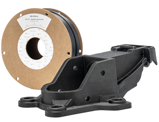 UltiMaker PPS CF is a carbon fiber reinforced polyphenylene sulfide (PPS) filament and the next level composite material for the UltiMaker Factor 4. It has excellent performance while still being easy to print using HT print cores.